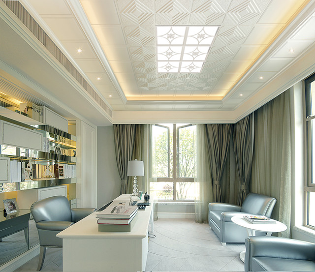 簡約美式風格的書房,簡潔明了,室內采用一色的灰白樣式,吊頂采用橫木樣式的,邊上裝上幾個小筒燈,使之書房增加明亮度。采用抽象繪畫和雕塑來裝飾,打破一些乏味、單調、生硬的線條,以期獲得完美豐富的空間感受。在這樣的書房,你的思緒是不是也會多一點呢?